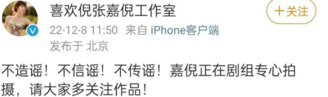 面对网上舆论,张嘉倪坐不住了,通过社交账号回应离婚,辟谣净身出户,称:不造谣、不信谣、不传谣,嘉倪正在剧组专心拍摄,请大家多关注作品。虽然没有明确表示,但也能看出,与买超并没有离婚,更没有净身出户一说,而是忙着拍摄新作品。
