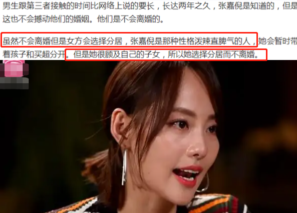 想必她都是很清楚的,自然会从长远出发。况且他也知道了男方实质性出轨证据,算是拿到他的把柄,这点波折无法撼动他们的婚姻,牵扯的东西太多,也会顾及自己的孩子,现在不是时机。所以网上传闻张嘉倪选择与买超分居,因为她接受不了老公背叛自己。