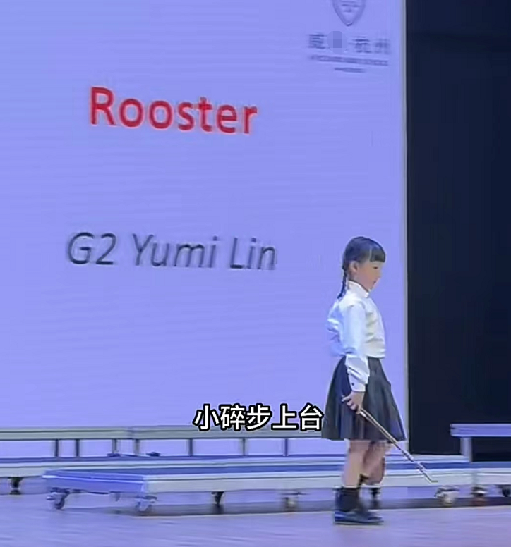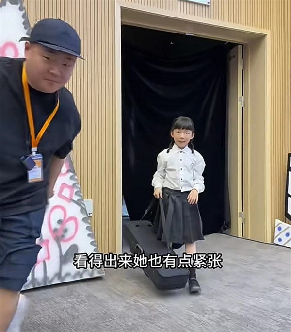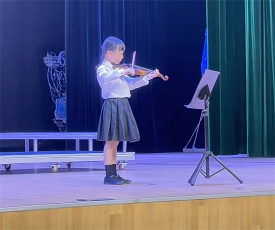 镜头一转,读小学二年级的Yumi拿着小提琴登台表演。她穿着白色衬衫和黑色裙子,头发扎成麻花辫,造型很是大方得体。