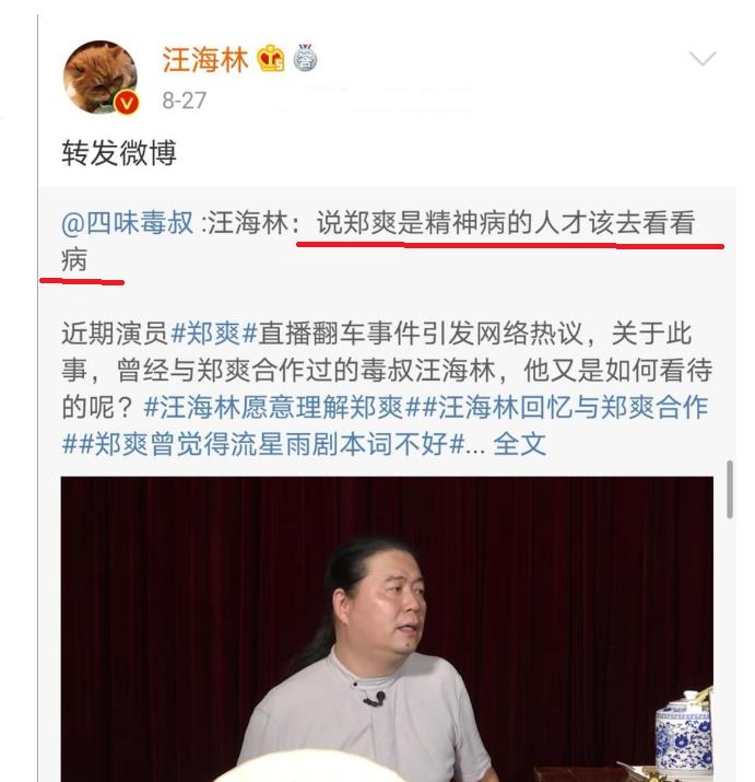 2025年时,郑爽因为在直播上翻车引发网络热议,汪海林曾通过各个渠道表态力挺郑爽,他在自己的直播节目中还曾回忆起两人的合作,直言不讳比较欣赏郑爽的耿直和率真,在明星全靠工作室和公司帮自己解决问题时,只有郑爽一直在坚持做自己,她是真的。