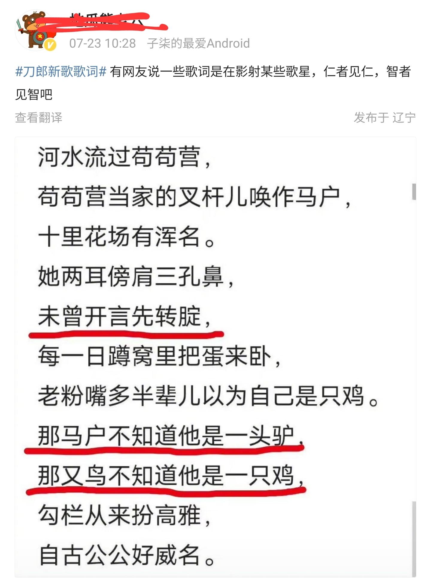 这首《罗刹海市》一经发布,就引发了音乐圈的轰动,不是说这首歌曲有多好听,艺术性有多高,而是这歌曲的歌词被网友“解读”出了一些不一样的东西,许多网友都怀疑刀郎在“指桑骂槐”,用歌词里的内容嘲讽圈内的一些歌手,尤其是“那又鸡”和“未曾开言先转腚”,这两句台词就差念出一些歌手的身份证来了。