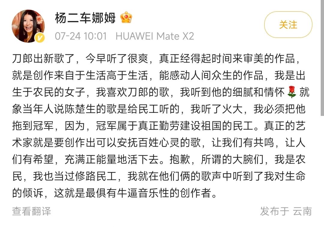 看得出,杨二车娜姆对刀郎的新歌曲评价非常高,已经从单纯的音乐角度上升到了感动人间的精神高度,作为一名“浸淫”在音乐圈多年的资深歌手,能对一个同行有如此评价,足见杨二车娜姆对刀郎新歌曲的喜爱了。