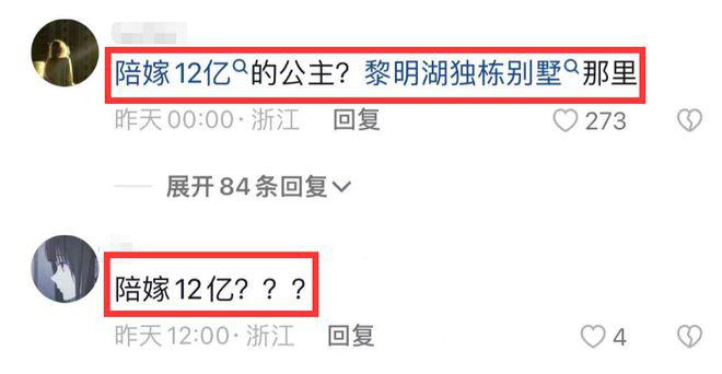 另外,还有爆料说,女方的陪嫁有 12 亿,网友还调侃说,是陪嫁 12 亿的公主 ?