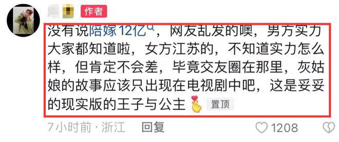 然而针对陪嫁 12 亿的爆料,男方亲友回应了,明确表示没有说陪嫁 12 亿,是网友乱发的,男方的实力大家都知道,女方江苏的,不知道实力怎么样,但肯定不差,还说两人是现实版的王子与公主。
