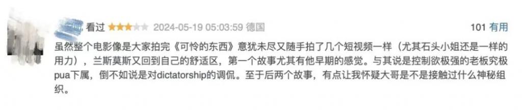 "整个电影像是大家拍完《可怜的东西》意犹未尽又随手拍了几个短视频一样。"