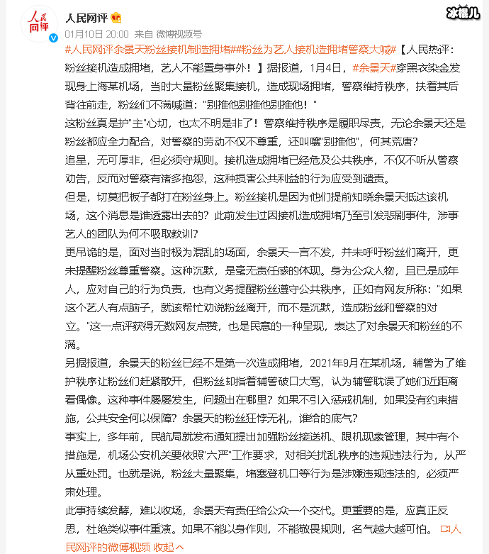 近日,在机场有粉丝接机艺人制造拥堵的视频被曝光,并引发网友们热议,该艺人正是参加过《青春有你3》选秀后又退出的余景天。人民网也关注到了此事并且发文评余景天粉丝借机制造拥堵事件。以下是全文内容:
