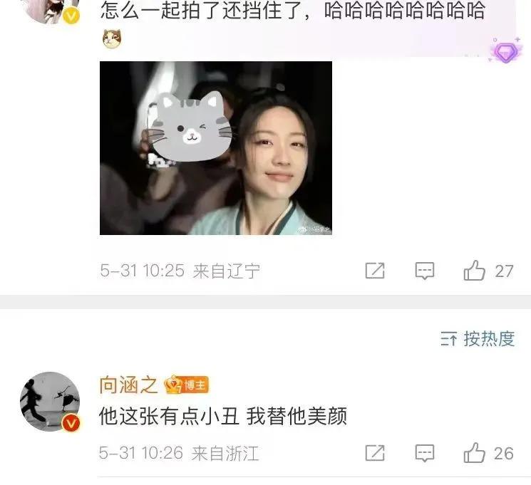 别的不说看得出来向涵之性格很活络,和周翊然私交不错,当时和王安宇合作也撸他的猫拍照,现在合作了也晒过和王星越的合照,还回复过相关评论,代入一下,这就是一个 e 人和不同合作项目的人正常沟通而已,只不过因为演员身份,这种亲密感被放大了而已 ……