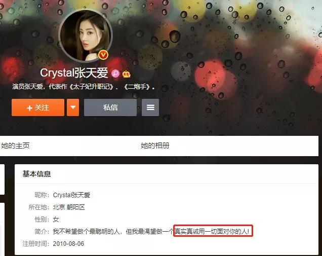 然而有意思的是,张天爱在自己社交平台上的简介竟然写的是,渴望做一个真实真诚用一切面对你的人!再看看她这飘忽不定的年纪,说好的真实真诚呢?
