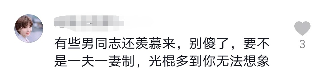 有些男同志还羡慕来,别傻了,要不是一夫一妻制,光棍多到你无法想象。