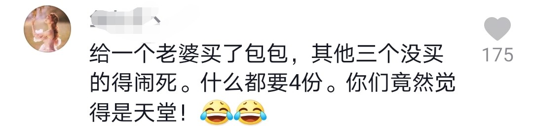 给一个老婆买了包包,其他三个没买的得闹死,什么都要4份,你们竟然觉得是天堂…