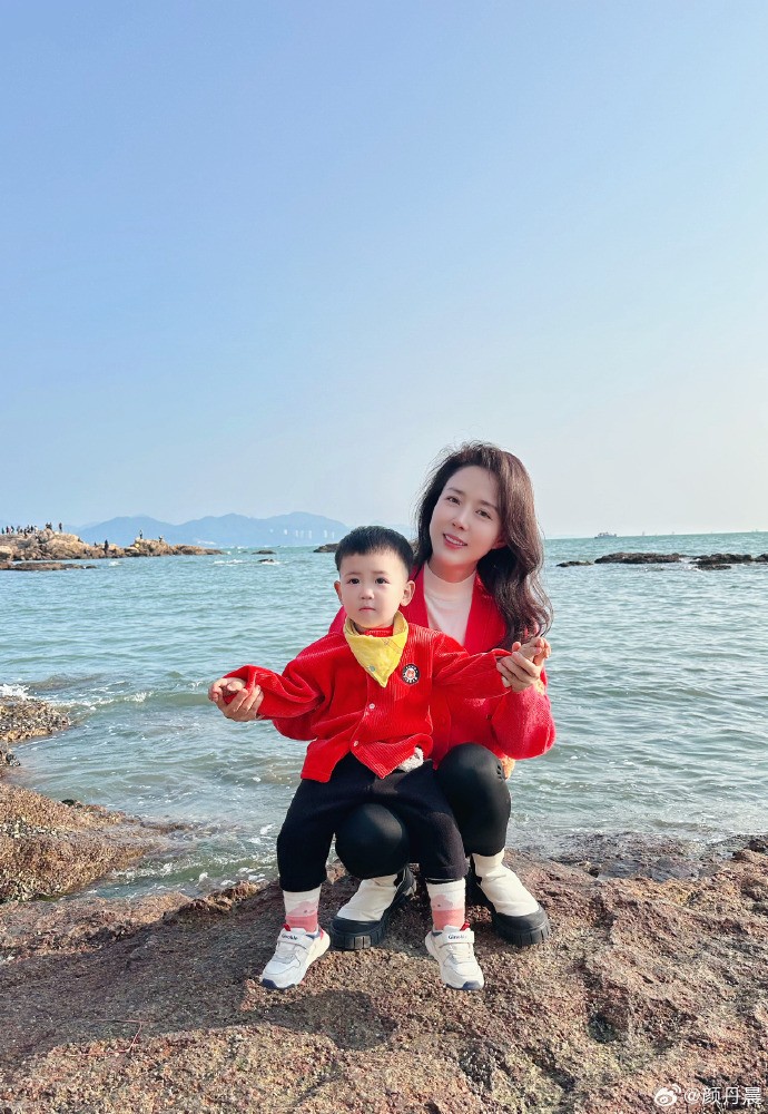 春节的时候,颜丹晨还和儿子穿上了亲子装。