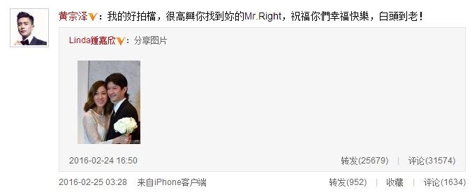 除了这个前男友,钟嘉欣的荧幕男友黄宗泽也送来了对两位新人的祝福...