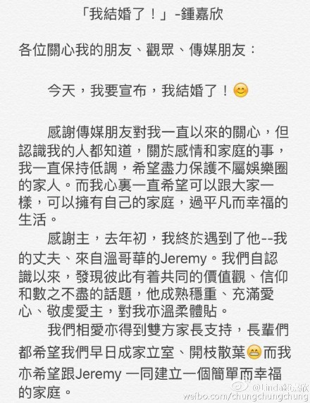 钟嘉欣日前在微博上承认自己已经结婚,老公是圈外人Jeremy,去年底二人在双方家长见证下,进行了庄严而简单的婚礼,喜酒将另行补办。