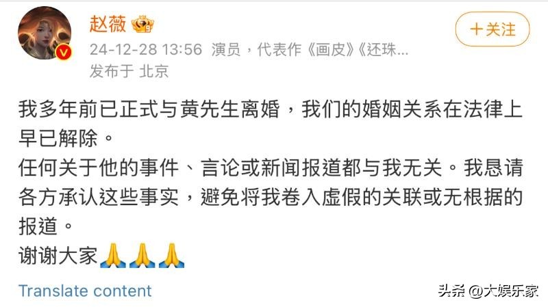 在赵薇的官宣离婚文中,提到自己已经和黄有龙离婚很多年,所以任何有关他的一切,和自己并没有关联。