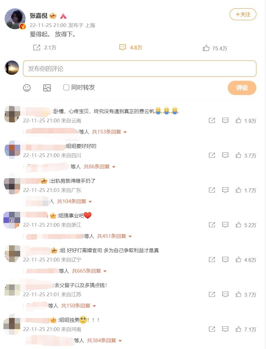 稍后,张嘉倪在社交平台发文:爱得起,放得下。