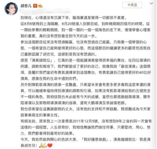 胡杏儿不久前因为参加综艺节目《演员请就位》第二季并夺得冠军而成功翻红,她在演技受到了很高的称赞,胡杏儿在结束之后还专门发文表达感慨,称自己从来没有想过输赢,只是抱着一颗学习的心,想让自己变得更好,并直呼:“我好钟意做戏”,表达了对演戏的热爱。