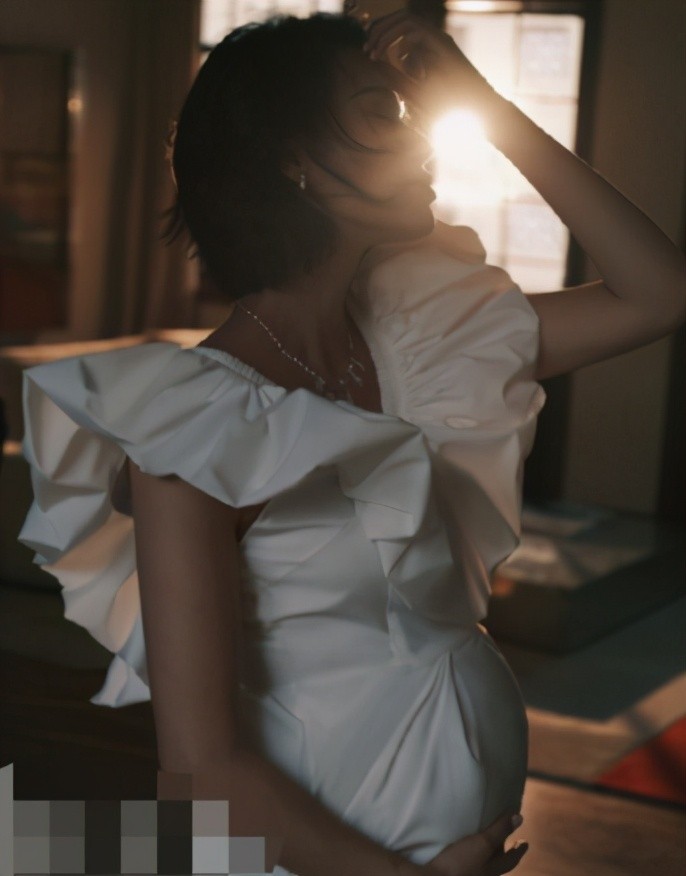 其中一张照片中,胡杏儿7个月大的孕肚已经十分明显,她留着短发造型,脸上还化着较为浓艳的妆容,身上穿着一件白色的V领吊带裙,半躺在椅子上,看起来十分性感。