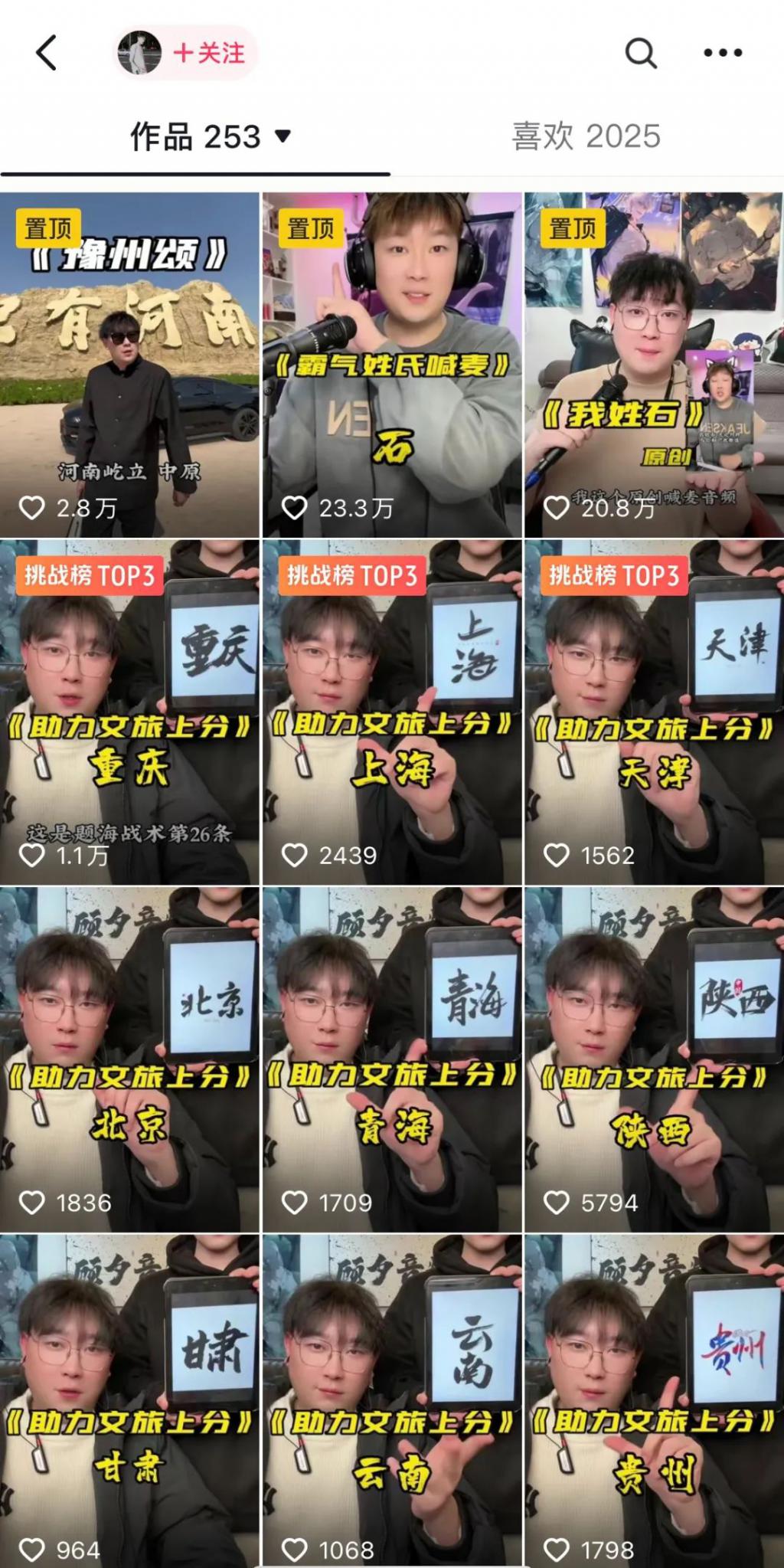 这两天最忙的,除了文旅局的剪辑、运营,还有《我姓石》的原唱顾夕。在这场文旅局的流量战中,喊麦式宣传《我姓 X》成为上分必备技能,打开短视频,几乎每个参与整活的文旅局都有一条同款宣传片。