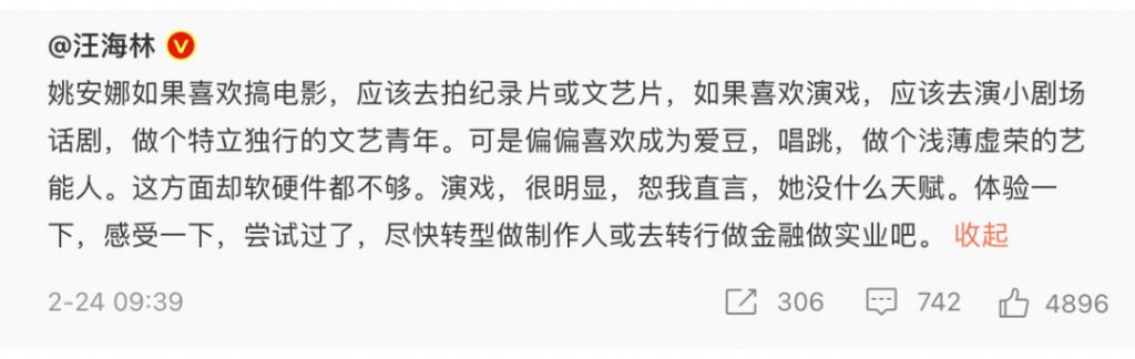 关于姚安娜带资进组,导演向资本低头的质疑声也与日俱增。