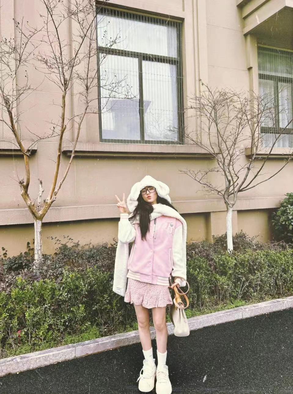赵露思早春穿粉色棒球服配碎花短裙,学院风穿搭尽显少女心
