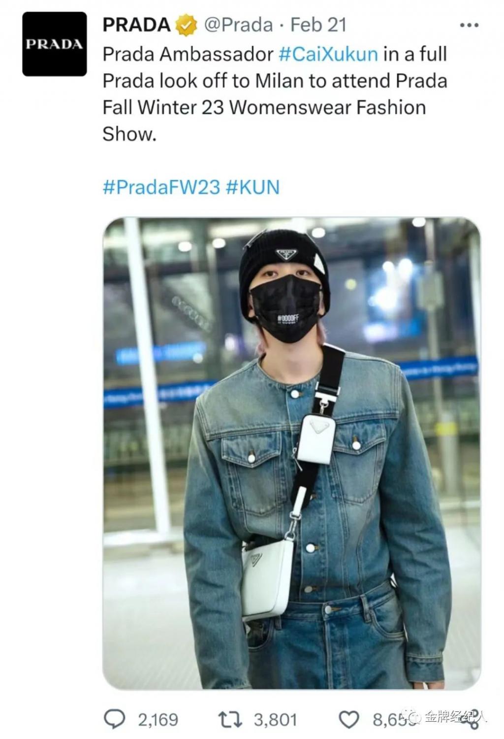 Prada 代言人蔡徐坤从机场出发开始就备受关注,而他也是唯一一个被 Prada 全网官宣的明星看秀嘉宾。