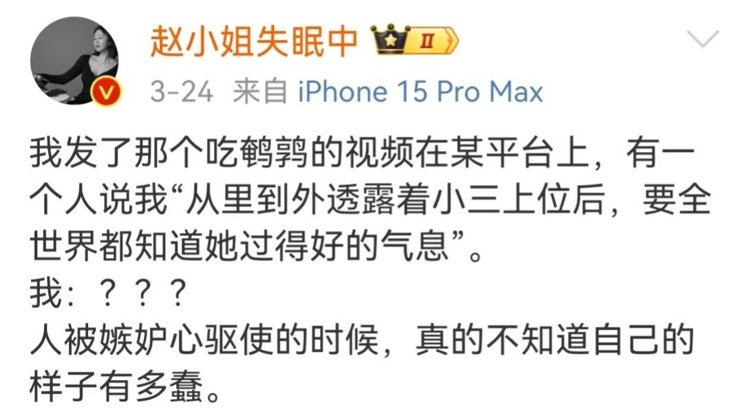 最近赵小姐在发文中自爆,因为自己发布了吃鹌鹑的视频,被人说成是小三上位。