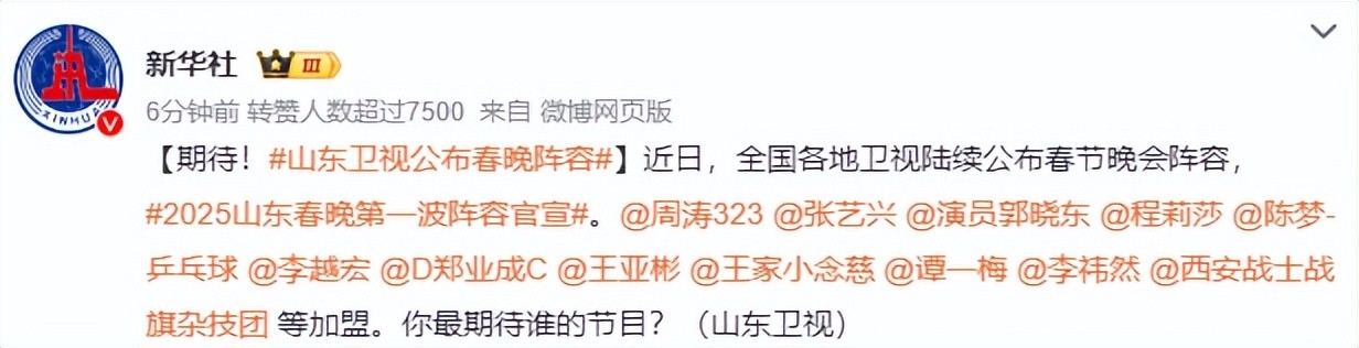 2025山东、江苏卫视春晚首波阵容曝光,主持人周涛再扛大旗!