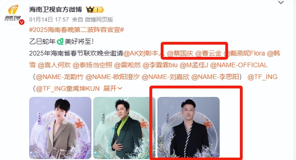 除了这两大卫视之外,海南卫视也官宣了春晚阵容,其中就包括蔡国庆、韩雪等人,甚至就连许久未曾上演的曹云金,也加盟了湖南卫视的春晚,这阵容,真的一个比一个让人兴奋。