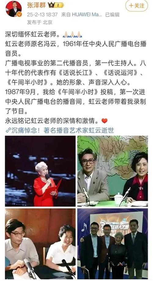 主持人张泽群在得知虹云老师离世的消息后,第一时间发文追忆。1987年9月,张泽群还是一个初出茅庐的小伙子,他向《午间半小时》投稿,幸运地得到了录制节目的机会。而带领他走进播音间,指导他完成录制的,正是虹云老师。张泽群回忆说,当时自己特别紧张,声音都有些颤抖,是虹云老师的耐心鼓励,让他逐渐放松下来。虹云老师的每一个微笑、每一句指导,都让他感受到了前辈的关怀和温暖。这份知遇之恩,张泽群一直铭记在心。
