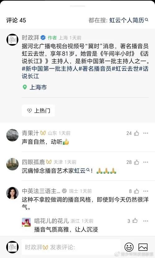 虹云老师的离去,让无数网友感到悲痛。有人说:“小时候每天早上听着虹云老师的声音起床,那声音就像冬日里的暖阳,温暖又亲切。”还有人说:“她是播音界的传奇,她的精神将永远激励着我们在追求梦想的道路上不断前行。”