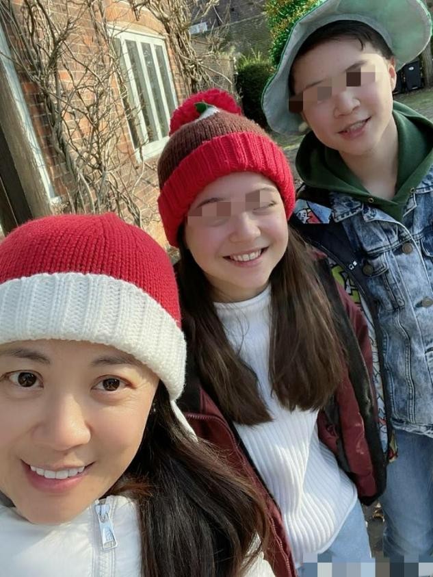 当日姜丰穿着厚实外套搭配红色毛线帽,看起来十分应景。站在她身后的一对混血儿女笑容灿烂干净,看上去十分可爱乖巧。