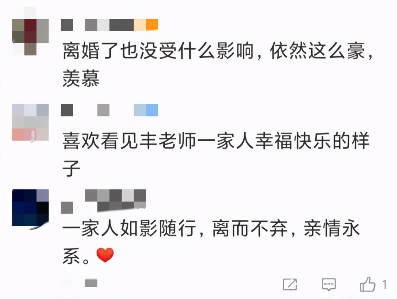 在姜丰晒出的动态下网友发表评论称“离婚也没受什么影响,依然这么豪羡慕”,有网友留言“喜欢看到丰老师一家人幸福快乐的样子”,有网友感叹“一家人如影随行,亲情永系”。