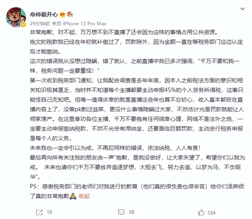 不过,在这篇道歉长文中, 我们所看到的全是狡辩之词。据他所言,自己之所以偷逃税是因为相关税务知识匮乏,并不知道每个主播都要主动申报45%的个人劳务所得税。