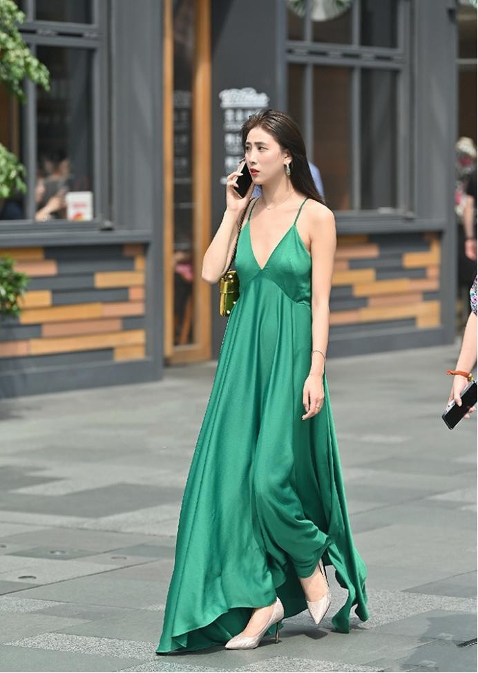 在夏天穿一袭绿色的雪纺小吊带长裙,真的是太吸晴了,绿色的颜色本身就很扎眼,所以穿上之后,立马能吸引眼球,而且雪纺材质的衣服比较贴身清透,可以将曲线柔和的展现出来,看这位小姐姐的绿色小吊带则进行了高腰的设计,真的是胸以下全都是腿,再加上这件裙子本身极强的垂落感,非常的飘逸,看起来就很凉快。