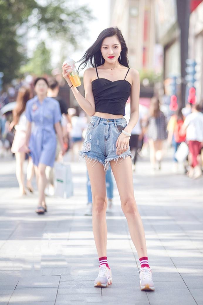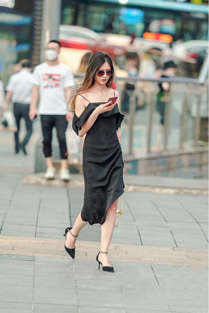 再来看看这位迎面走来的小姐姐,气场不是一般的足,这小细腰大长腿,身材真是太好了,还穿了一件黑色的小吊带。将精致的锁骨和纤细的瘦腰展现得一览无余,而且靓丽的外表看起来非常的有攻击性。看看旁边的大哥都走不动啦,足以可见小吊带的魅力有多大。
