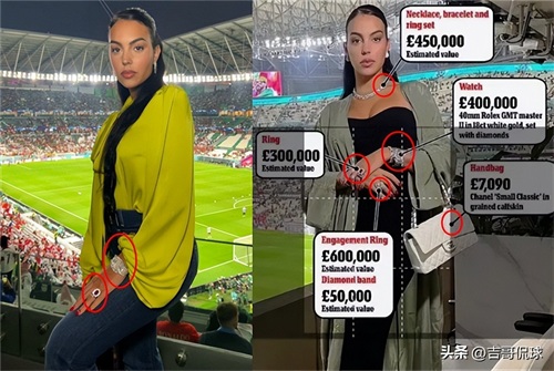 英国媒体指出,乔治娜现身世界杯时,身上的穿戴饰品总计达到180万美元以上(人民币1200万元),实在太夸张了。此前,乔治娜还受到了卡塔尔王室成员的接见,并且被曝出疯狂购买当地顶级奢侈品的画面。