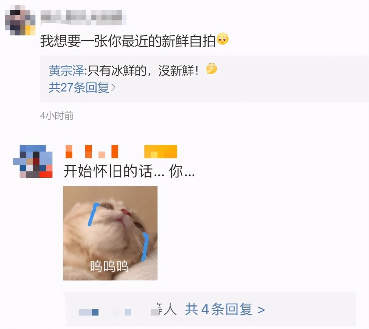 有网友在评论区留言道"想要一张你最近的新鲜自拍",然而黄宗泽本人亲自现身回复表示"只有冰鲜的,没新鲜",逗趣十足。