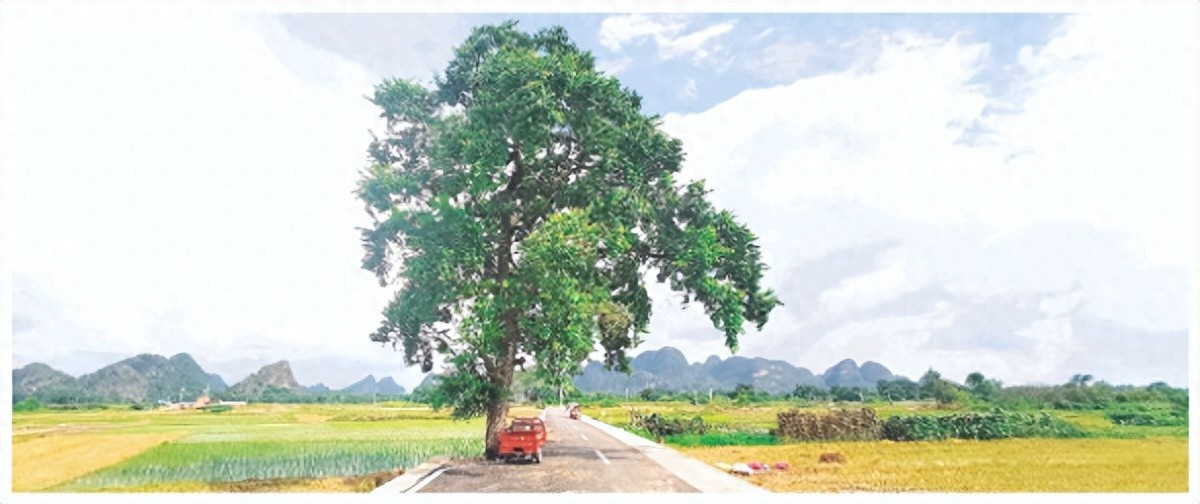 8月2日下午3点多,记者来到柘木村委,找到了这棵生长在机耕路边的“柘漓树先生”。它主干粗六七十厘米,高十三四米。树旁边,新修的柏油路非常笔直平整,延伸到远处。站在机耕路上往东南方望,蓝天白云下,高大的乌桕树矗立在笔直的柏油路边,远处奇峰秀丽,一幅田园美景就这样呈现在眼前。