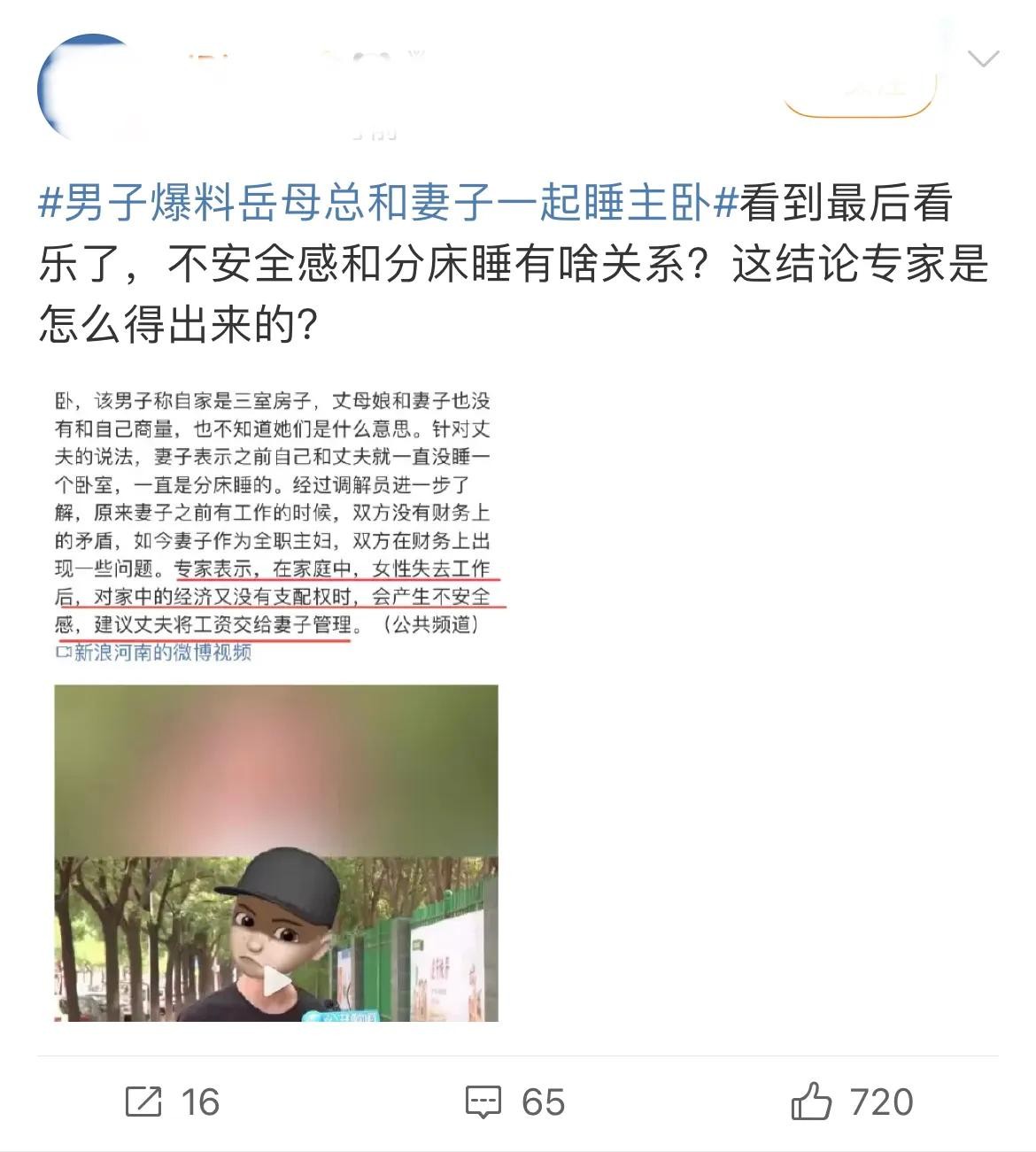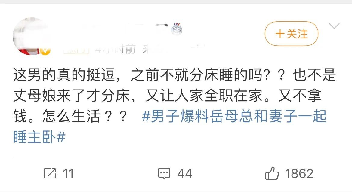 男子爆料岳母总和妻子一起睡主卧 妻子:之前就是和丈夫分床睡