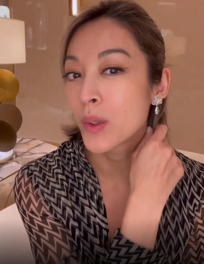 她耳朵上戴了一对花瓣形状的耳环,设计非常精致。她大方对着镜头展示,还介绍起耳环的设计和切工等。