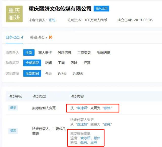 不仅如此,重庆丽妍文化公司是袁冰妍 100% 持股的。公司的偷税漏税实际上就是袁冰妍自己偷税漏税,不仅如此,在公司遭受到罚款之后,袁冰妍不仅没有第一时间出来道歉和声明,反倒是悄悄的将职务等都更改了,董事经理等都变成了另外一个人,试图撇清关系。