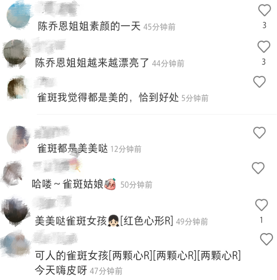 看到陈乔恩的动态后,网友们纷纷称赞她的真实:“陈乔恩姐姐素颜的一天”“雀斑我觉得都是美的,恰到好处”“可人的雀斑女孩”。