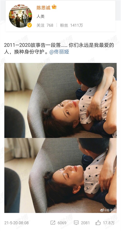 陈思诚发文称:“2011—2020故事告一段落…… 你们永远是我最爱的人,换种身份守护。@佟丽娅 ”他还附上了两张佟丽娅和孩子的照片。