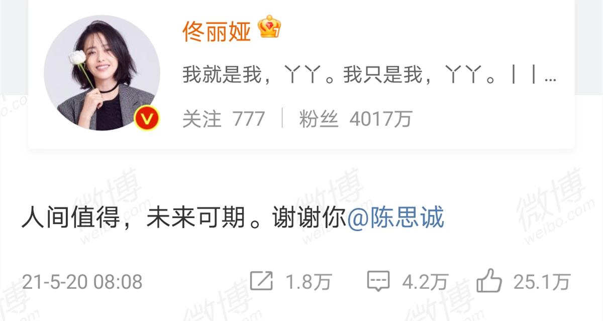 而佟丽娅则发微博表示:“人间值得,未来可期。谢谢你@陈思诚 ”
