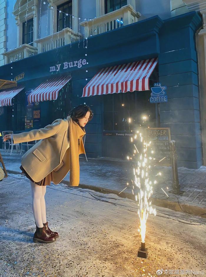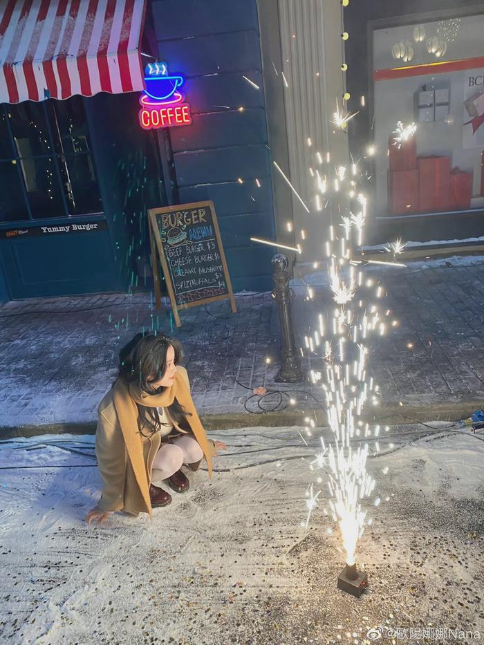 欧阳娜娜微博更新:每想你一次,天上就飘落一粒雪 雪景烟花……