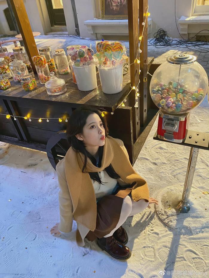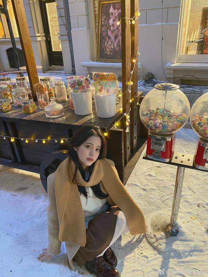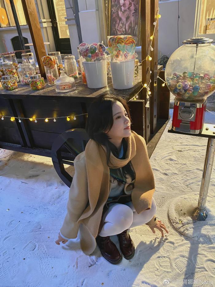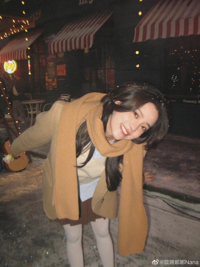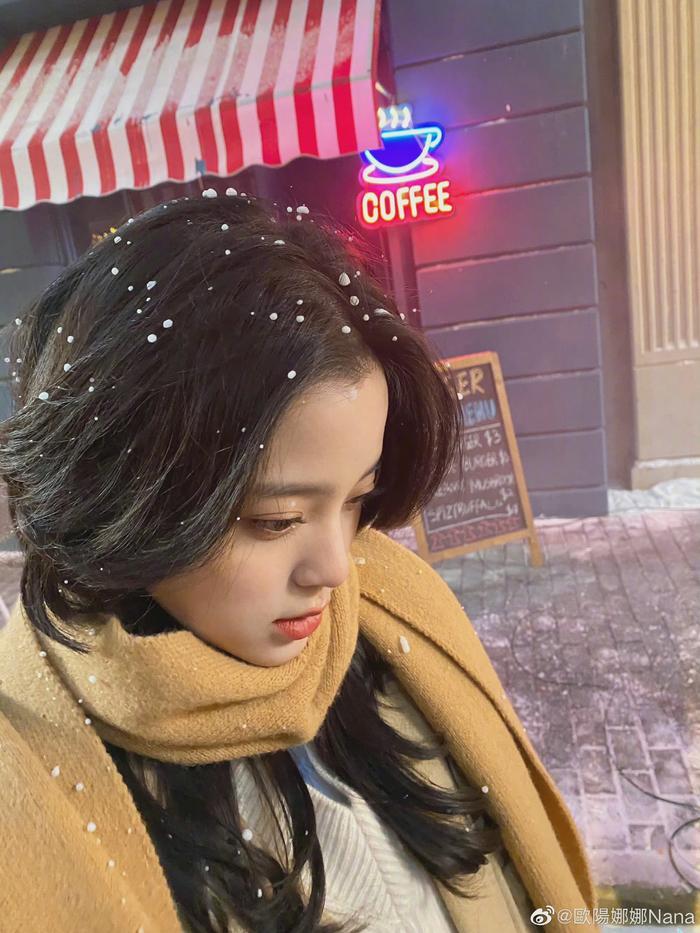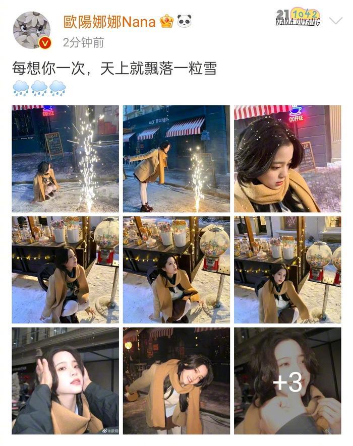 欧阳娜娜微博更新:每想你一次,天上就飘落一粒雪❄️❄️❄️