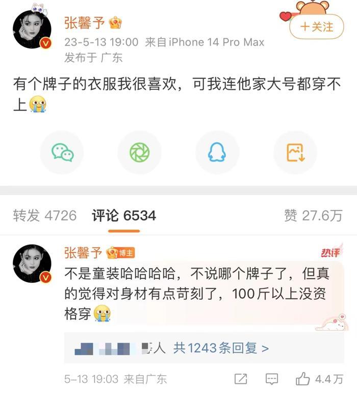 前段时间,她发微博说自己很喜欢某品牌的衣服,可是却连他家的大号都穿不进去。