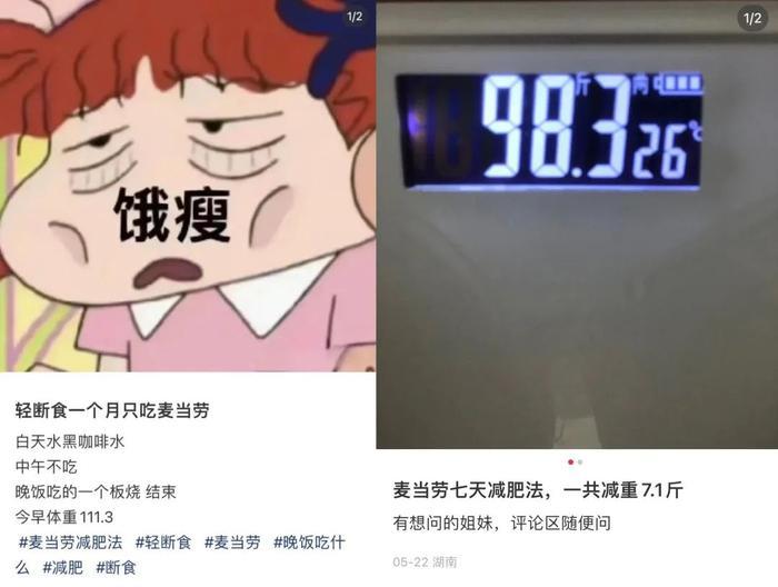 在女性用户聚集地某红书上,有成千上万分享减肥经验的笔记,比如麦当劳减肥法,声称7天减重7斤。