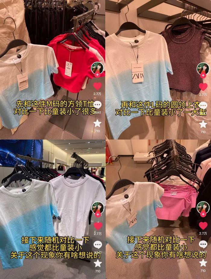 也有网友特意去一家店铺对比同时出售的童装和女装,一件140cm大小,适合8-10岁孩子穿的普通T恤,比任意拿起来对比的4件女装上衣都要更大。