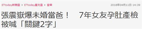据台湾媒体报道,张震岳被拍到和女友一起到妇产科做检查,女友小涵当天穿着比较宽松的连衣裙配平底鞋,看上去小腹突起,疑似怀孕。